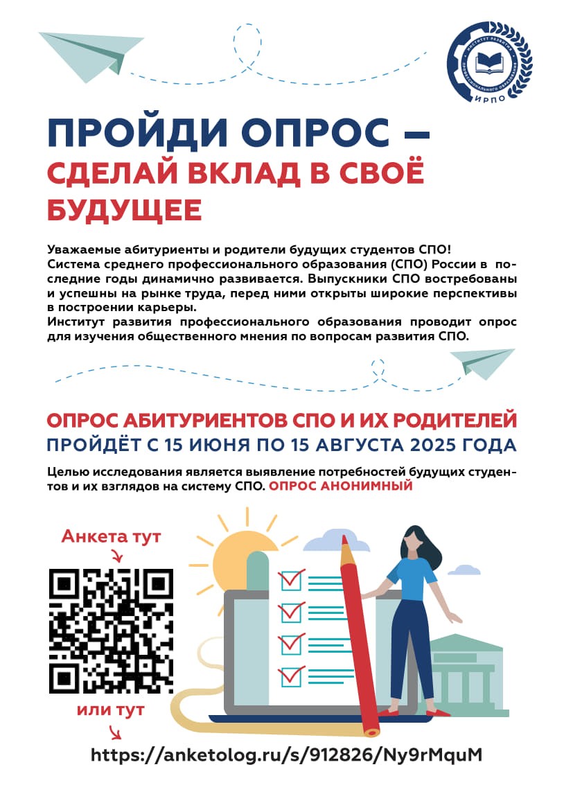ФГБОУ ДПО «Институт развития профессионального образования» в рамках приемной кампании проводит анонимный социологический опрос абитуриентов среднего профессионального образования (далее – СПО) и их родителей. Целью опроса является выявление мнений и взглядов будущих студентов и их родителей на систему СПО.